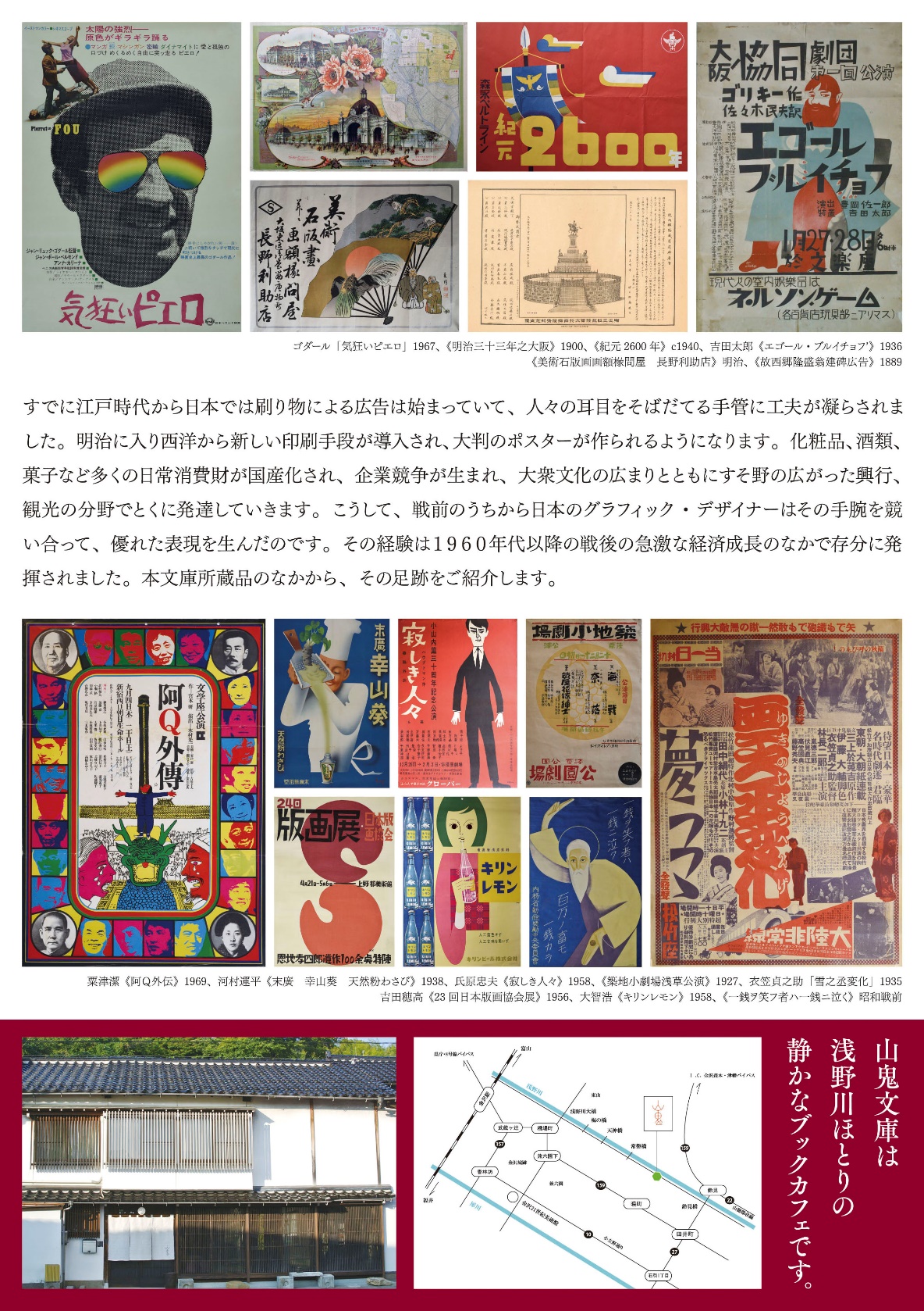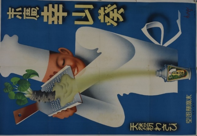 すでに江戸時代から日本では刷り物による広告は始まっていて、人々の耳目をそばだてる手管に工夫が凝らされました。明治に入り西洋から新しい印刷手段が導入され、大判のポスターが作られるようになります。化粧品、酒類、菓子など多くの日常消費財が国産化され、企業競争が生まれ、大衆文化の広まりとともにすそ野の広がった興行、観光の分野でとくに発達していきます。こうして、戦前のうちから日本のグラフィック・デザイナーはその手腕を競い合って、優れた表現を生んだのです。その経験は1960年代以降の戦後の急激な経済成長のなかで存分に発揮されました。本文庫所蔵品のなかから、その足跡をご紹介します。