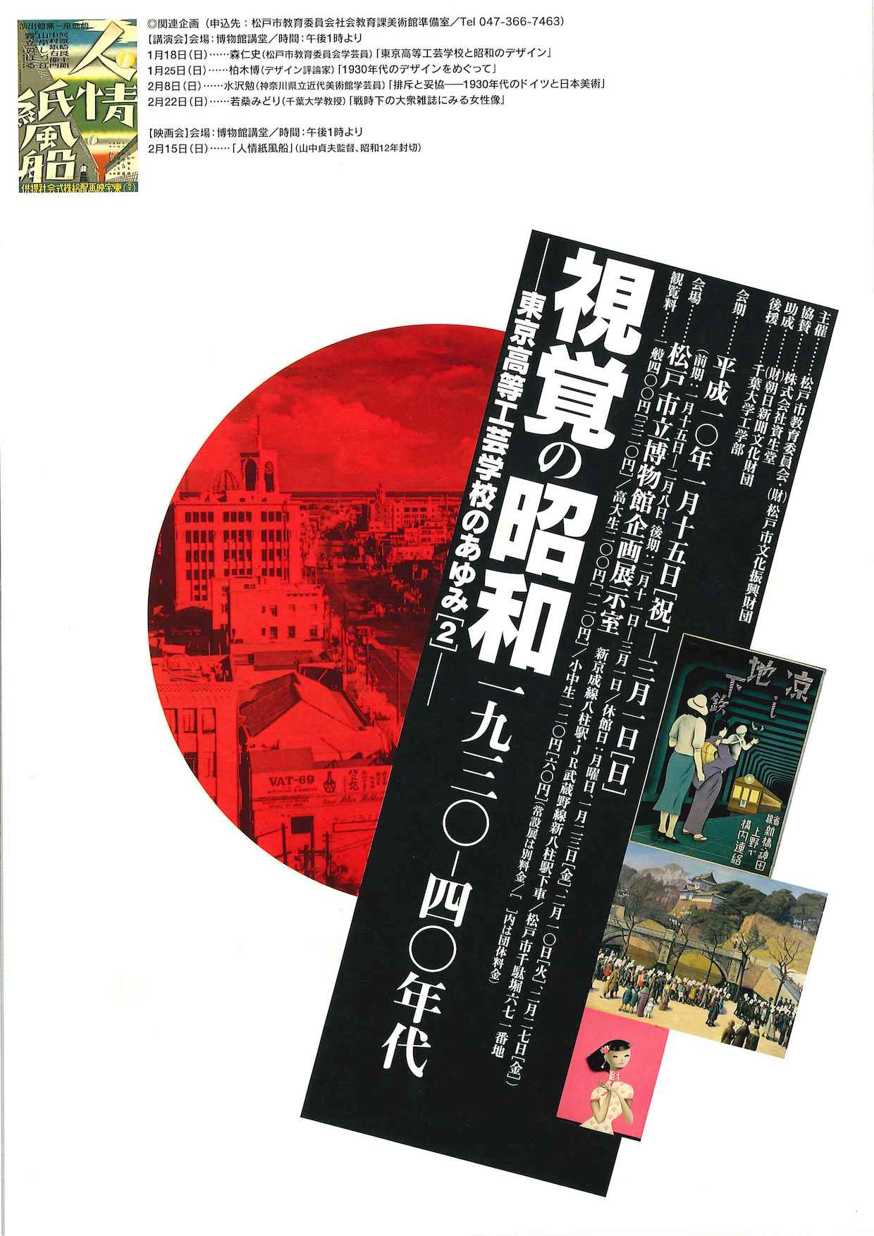 1945年松戸に移転し、64年まで所在した東京高等工芸学校(千葉大学工学部)の活動を紹介するシリーズ展覧会の1回目。創設時の教員の活動を紹介。とくに木檜恕一自邸、木のめ舎、型而工房など1920年代のオリジナル家具は初公開。