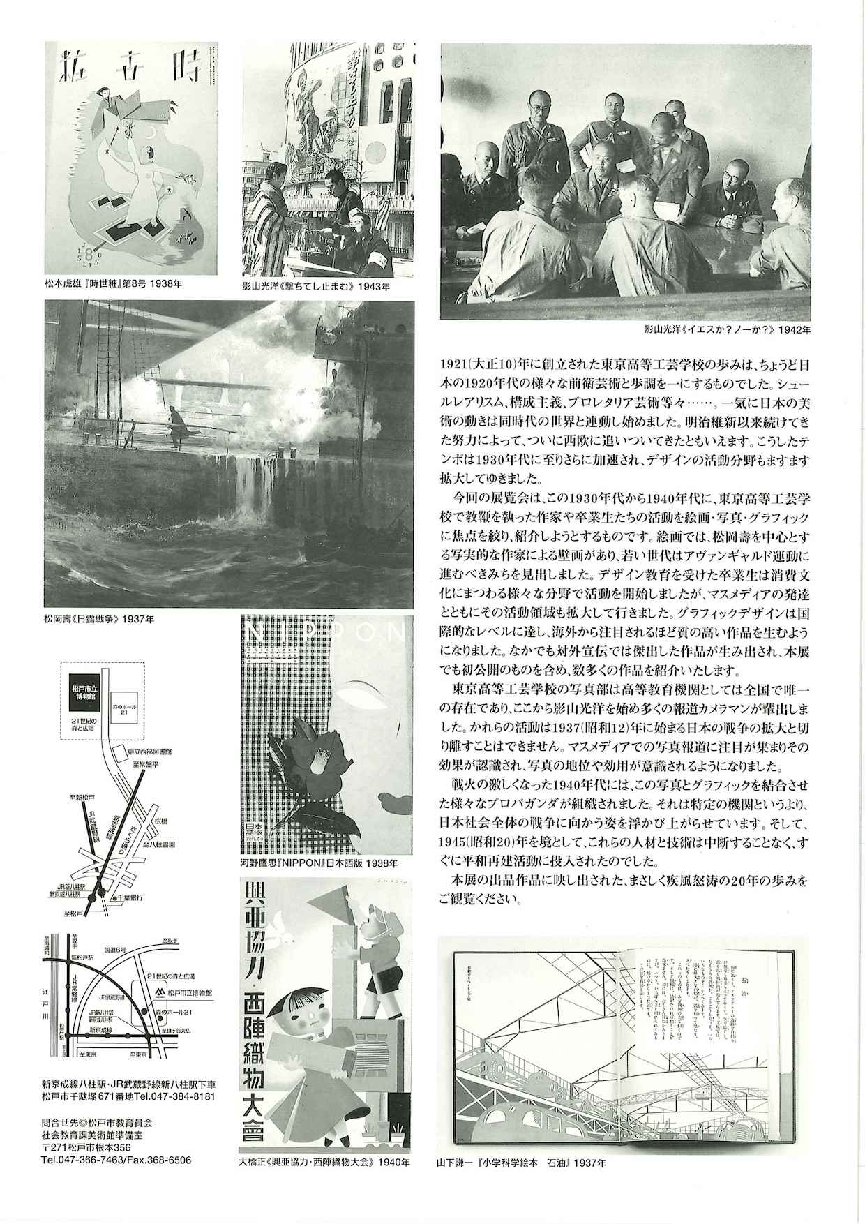 東京高等工芸学校の教員と卒業生の活動のうち、壁画(東京府養正館)、写真(新聞社カメラマン、戦時報道)、グラフィックデザイン(ポスター、対外宣伝)を中心に紹介。