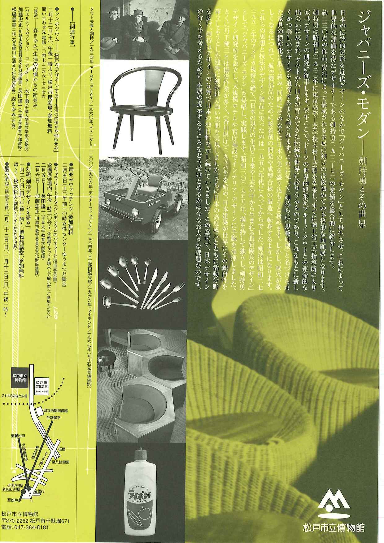 戦後日本の代表的インテリアデザイナー剣持勇の初めての個展。学生時代の習作から晩年の京王プラザホテルまでの代表作を剣持デザイン研究所の全面的な協力を得て網羅的に展示。