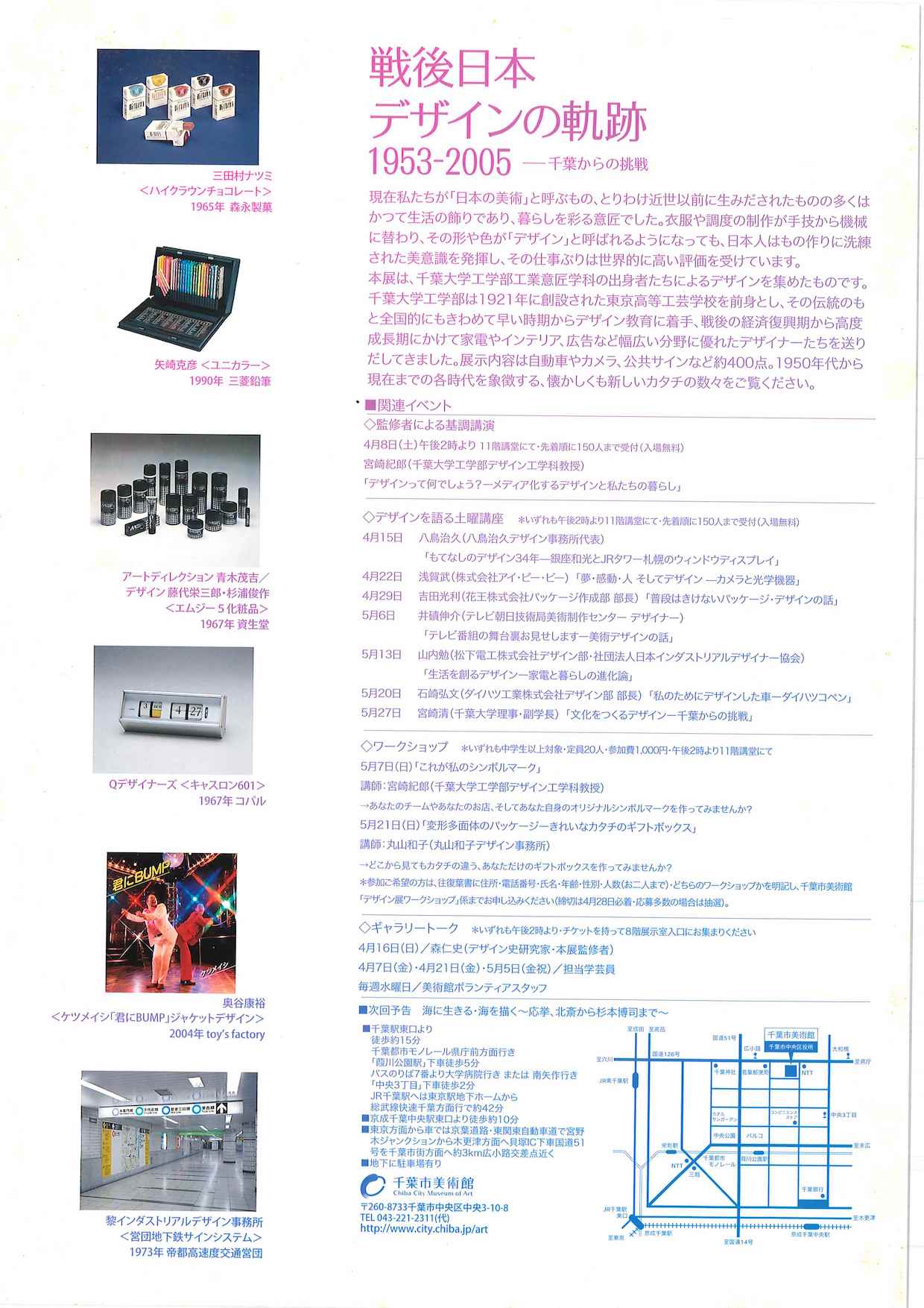 千葉大学工学部発足の1953年から2005年までの卒業生のデザイン活動を網羅的に紹介。インダストリアルデザイン(電化製品、陶磁器、自動車、バイク、文房具、時計、コンピュータ)、インテリアデザイン(浴室、紙管住宅、椅子)、サインデザイン、広告(ポスター)など。