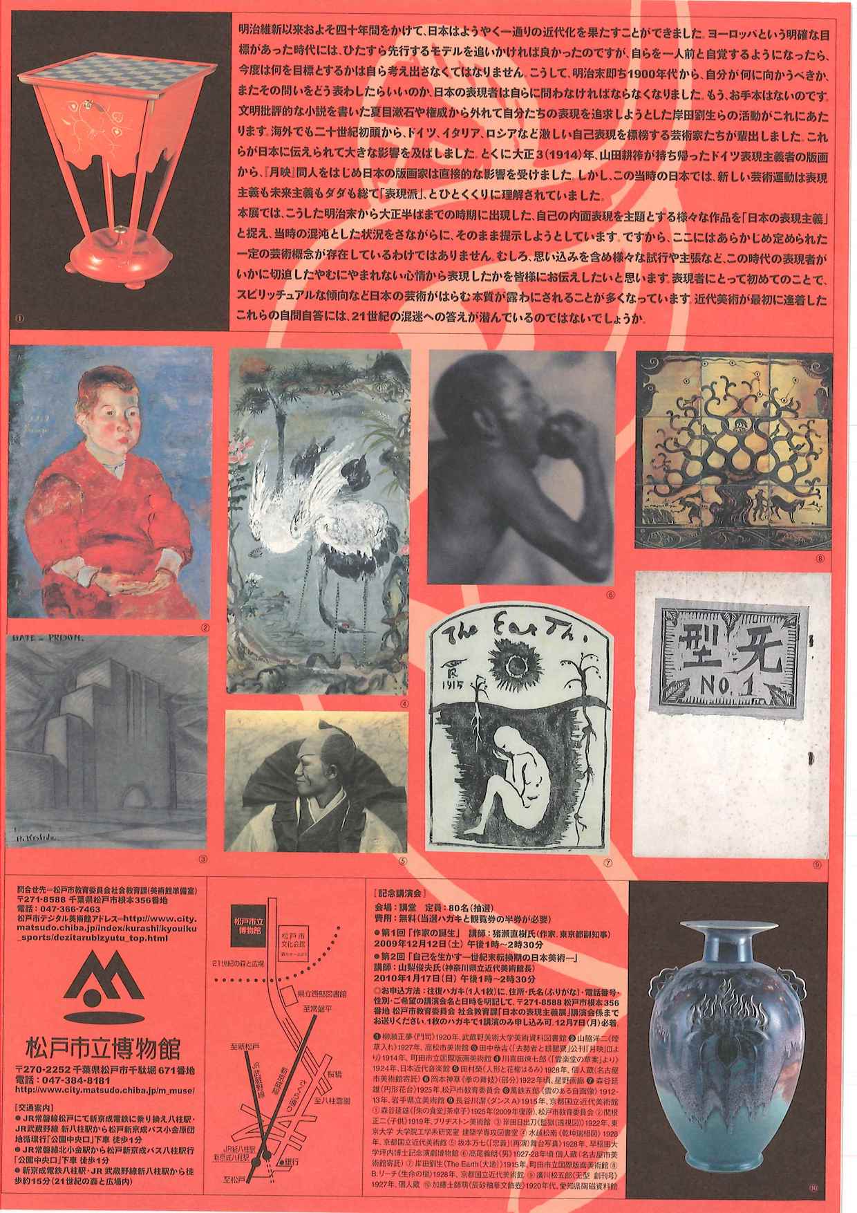 1920年代以降の日本にあらわれた西洋模倣を離れて以降の激しい主観表現を表現主義と捉え、絵画、デザイン、建築、工芸、演劇、舞踊、グラフィックなど幅広く網羅的に紹介。